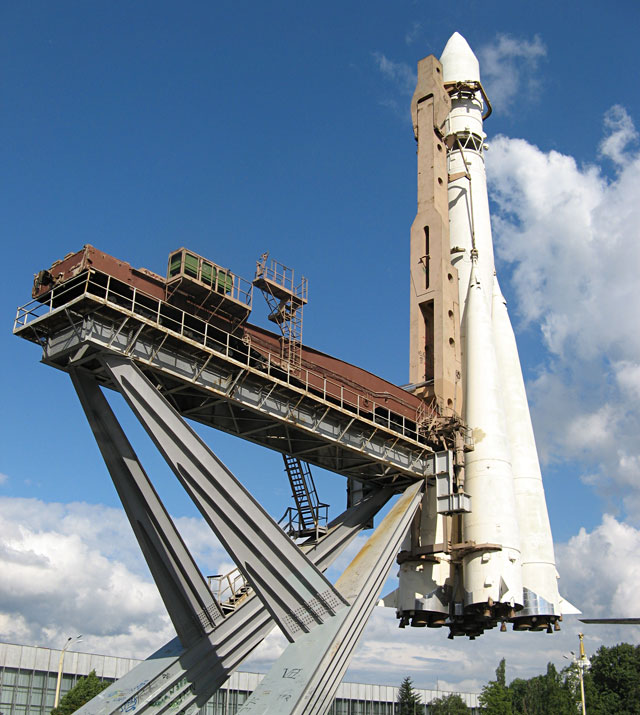 Arriba: Plano técnico detallado del lanzador R-7 Vostok de la nave Vostok 1 de Gagarin (cotas en mm). [Clic en la imagen para ampliar] • Abajo: Reproducción a escala real del cohete R-7 Vostok 1 tal y como se ve en la actualidad expuesto al aire libre en Moscú. [Foto: Developer88 en DeviantArt]