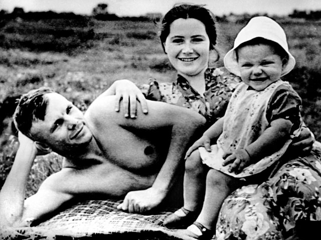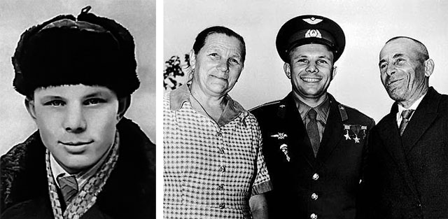 Derecha: Yuri en su época adolescente en Moscú a principios de la década de 1950 • Izquierda: Junto a sus padres, Anna y Alexéi Gagarin, en 1961.