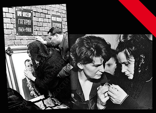 Izquierda: Valentina Gagarina llora desconsolada delante de un retrato de su marido en el lugar donde fue enterrado: la muralla del Kremlin de Moscú, el lugar de honor reservado para que reposen los restos mortales de las grandes figuras históricas del país de los soviets • Derecha: Valentina Tereshkova (izquierda) acompaña a la viuda de Gagarin durante las honras fúnebres en la Plaza Roja.