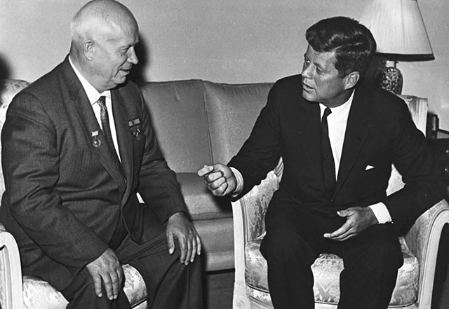 El líder soviético Nikita Jruschov, secretario general del PCUS, y John F. Kennedy, presidente de Estados Unidos, durante una cumbre soviético-americana celebrada en 1961.