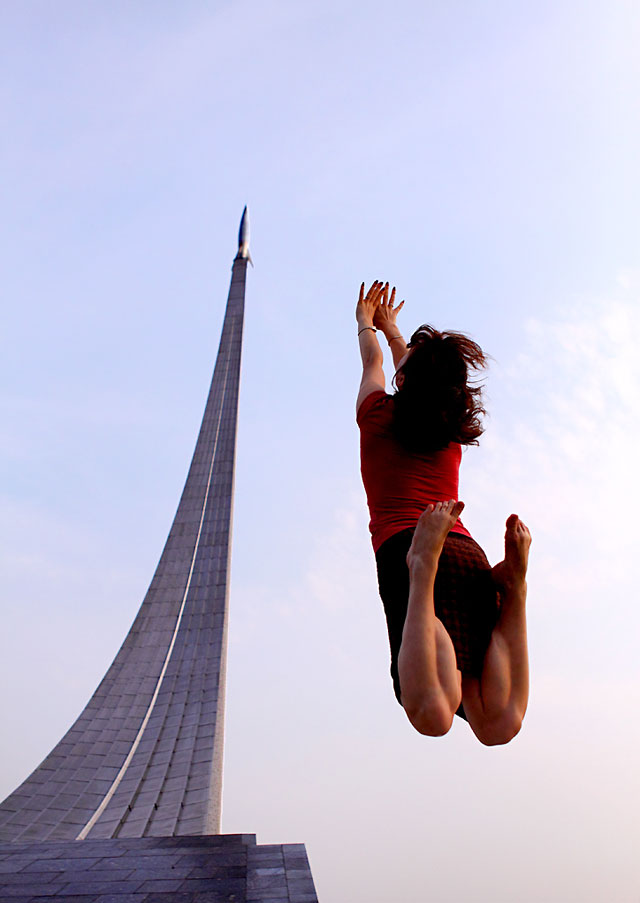 ‘Monumento a los conquistadores del Cosmos’. Esta ‘macroescultura’ de más de 100 metros de altura fue erigida por la URSS en 1963-1964 para celebrar los logros del pueblo soviético en la exploración espacial. En su interior está albergado el Museo de la Cosmonáutica. Escultor: A.P. Faidysh-Krandievski; arquitectos A.N. Kolchin y M.O. Barshch. Localización: Prospect Mira (Moscú, Federación Rusa) [foto: Fixzor]. Imagen inferior: Detalle del bajorrelieve en la base del monumento, frente a la cual se reproduce el poema en una placa. Algunas de las figuras representadas son Gagarin y Serguéi Koroliov (en actitud reflexiva en el relieve), el ‘ingeniero-jefe’ del programa espacial de la Unión Soviética. [Wikimedia Commons]
