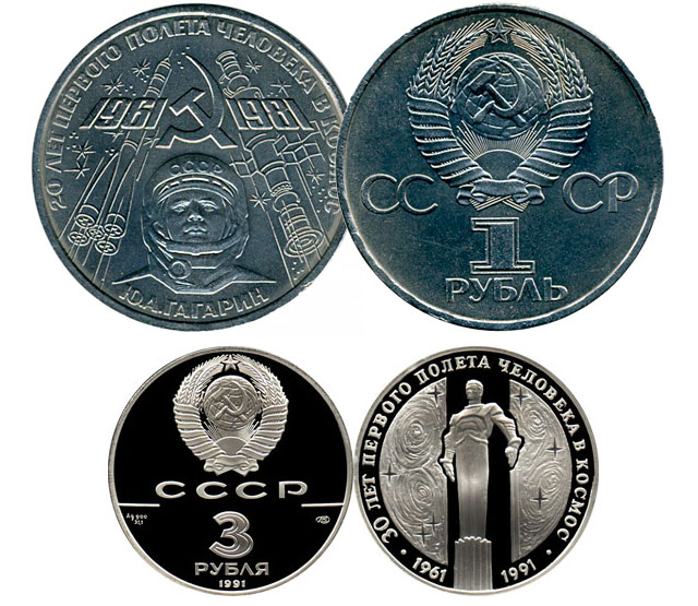 Arriba: Un rublo soviético de curso legal acuñado en 1981 con motivo del 20º Aniversario del vuelo de Gagarin (cupro-níquel-zinc). Abajo: Moneda soviética de tres rublos de una edición conmemorativa acuñada en 1991 (30º aniversario); probablemente se trate de una de las últimas monedas de la URSS, disuelta por Decreto de diciembre de ese mismo año.