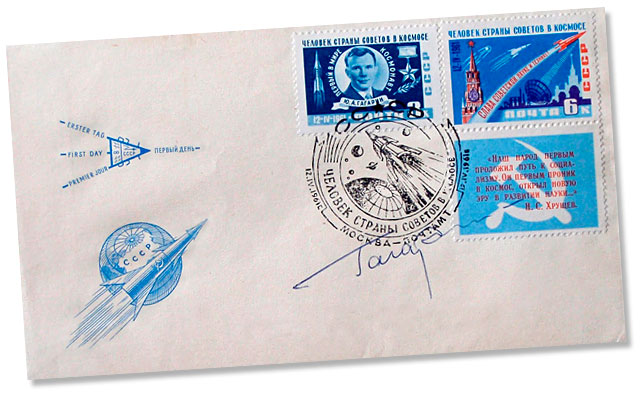 Sobre firmado por Yuri Gagarin con los sellos de una edición postal soviética conmemorativa del «Primer día», el 12 de abril de 1961. [Fuente: signedfdc.blogspot.com]