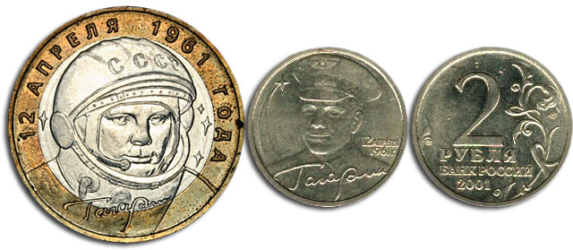 Monedas de curso legal de la Federación Rusa, puestas en circulación en 2001 con motivo del 40º Aniversario del vuelo de Gagarin. Izquierda: cara de 10 rublos; derecha: 2 rublos. [Aportación de brucknerite (La Yuriesfera)]