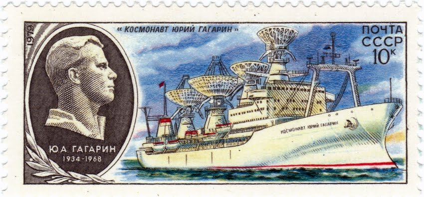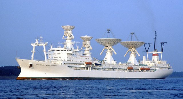 Desde principios de la «década prodigiosa» (1960) los astilleros de la Unión Soviética construyeron hasta una docena de grandes buques de comunicaciones cuya principal función era el puntual seguimiento de las misiones espaciales y su telemetría cuando las naves se encontraban fuera del alcance de las estaciones terrestres ubicadas dentro de los más de 22 millones de kilómetros cuadrados de tierra firme de la URSS. La silueta inconfundible de estas naves —por sus grandes antenas y enormes dimensiones— era todo un espectáculo para los marinos de todo el mundo en alta mar así como en los puertos donde atracaban. El buque insignia de esta flota era el ‘Kosmonavt Yuri Gagarin’, botado en 1971 en los Astilleros de Leningrado coincidiendo con el 10º Aniversario del vuelo de Yuri. Con una eslora de 231,6 m, además de sus cuatro grandes antenas (de 27 m de diámetro las dos de popa) este gran barco alojaba 86 laboratorios a bordo. Los 19.000 caballos de potencia de sus turbinas podían desplazar las 45.000 toneladas de este coloso de los mares a una velocidad de 17,5 nudos. Una de las muchas consecuencias de la disolución de la URSS fue que el ‘Kosmonavt Yuri Gagarin’ acabara vendiéndose a la India en 1996 para su desguace. [Clic en las imágenes para ampliar]